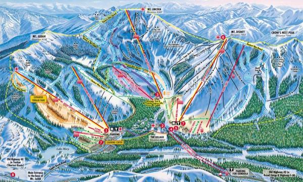 Rental facilities are located at both the Mt Judah Day Lodge as well as at the base of Mt Disney in the Village Rentals building. Both shops have an extensive selection of Volkl and Burton products. Basic packages of skis/boots/poles and boards/boots, as well as performance skis, are available.